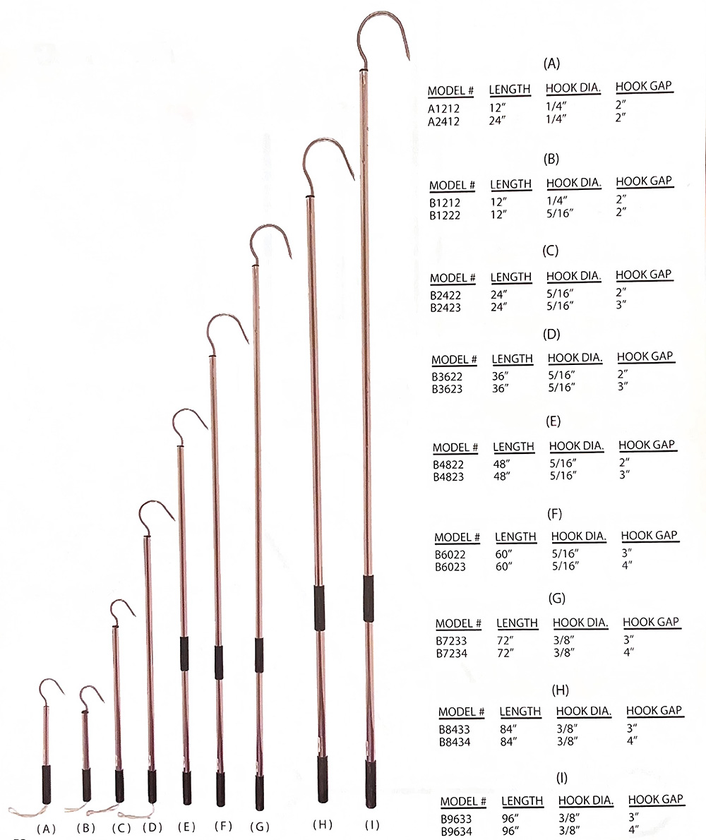 Aluminum Gaffs are aluminum and feature a shark's tooth point, foam grips, and are available in a variety of sizes: 12", 24", 36", 48", 60", 72", 84", 96"